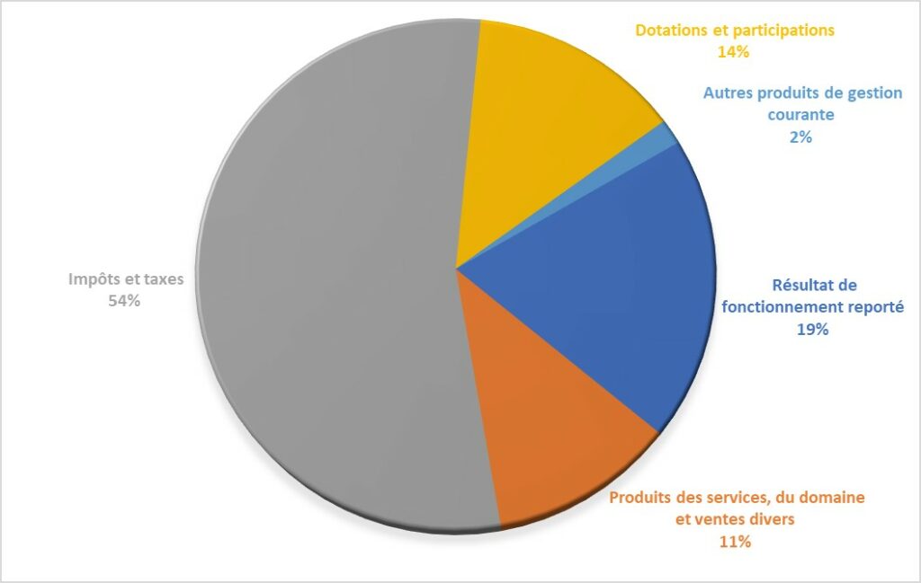 Les recettes de fonctionnement sont constituées des impôts des ménages perçus par la collectivité, d’autres impôts et taxes, des dotations de l’Etat et d’autres subventions et participations, des produits issus de la tarification des services et de divers produits de gestion courante.